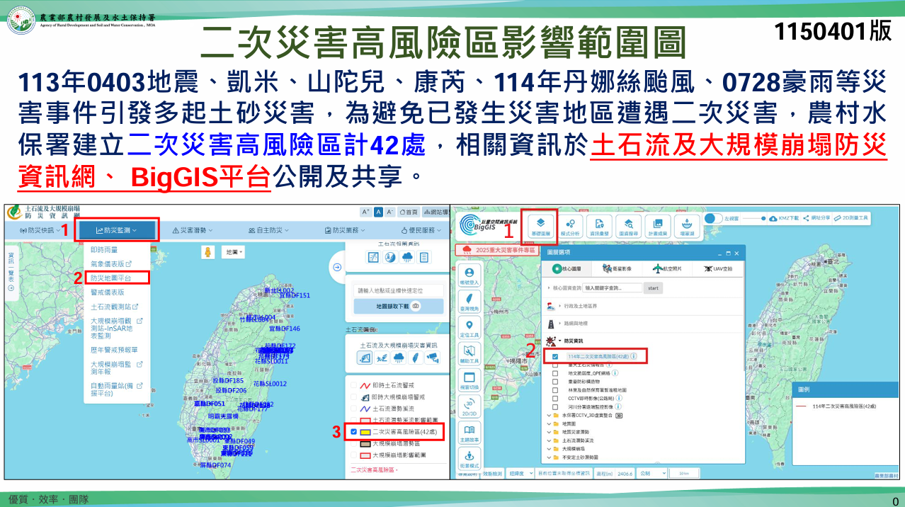 以地圖呈現土石流及大規模崩塌潛勢警戒圖與調查圖,相關圖層資訊以圖層方式呈現。