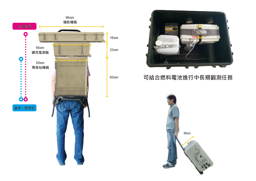 機動觀測站(VRSPL)的機箱主體設計,考量防水及高強度,機箱內裝置觀測儀器、通訊網路模組、資料處理模組及電源控制模組,部署時取出觀測儀器進行裝設,平時則收納於機箱內。