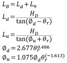 式中LB為天然壩堆積長度(m)、 Ld為天然壩下游堆積面長度(m)、 Lu為天然壩上游堆積面長度(m)、 HD為堰塞湖天然壩最小堆積高度(m)、 ∅d天然壩下游堆積面坡度(°)、 ∅u天然壩上游堆積面坡度(°)、 θr為河谷坡度(°)。