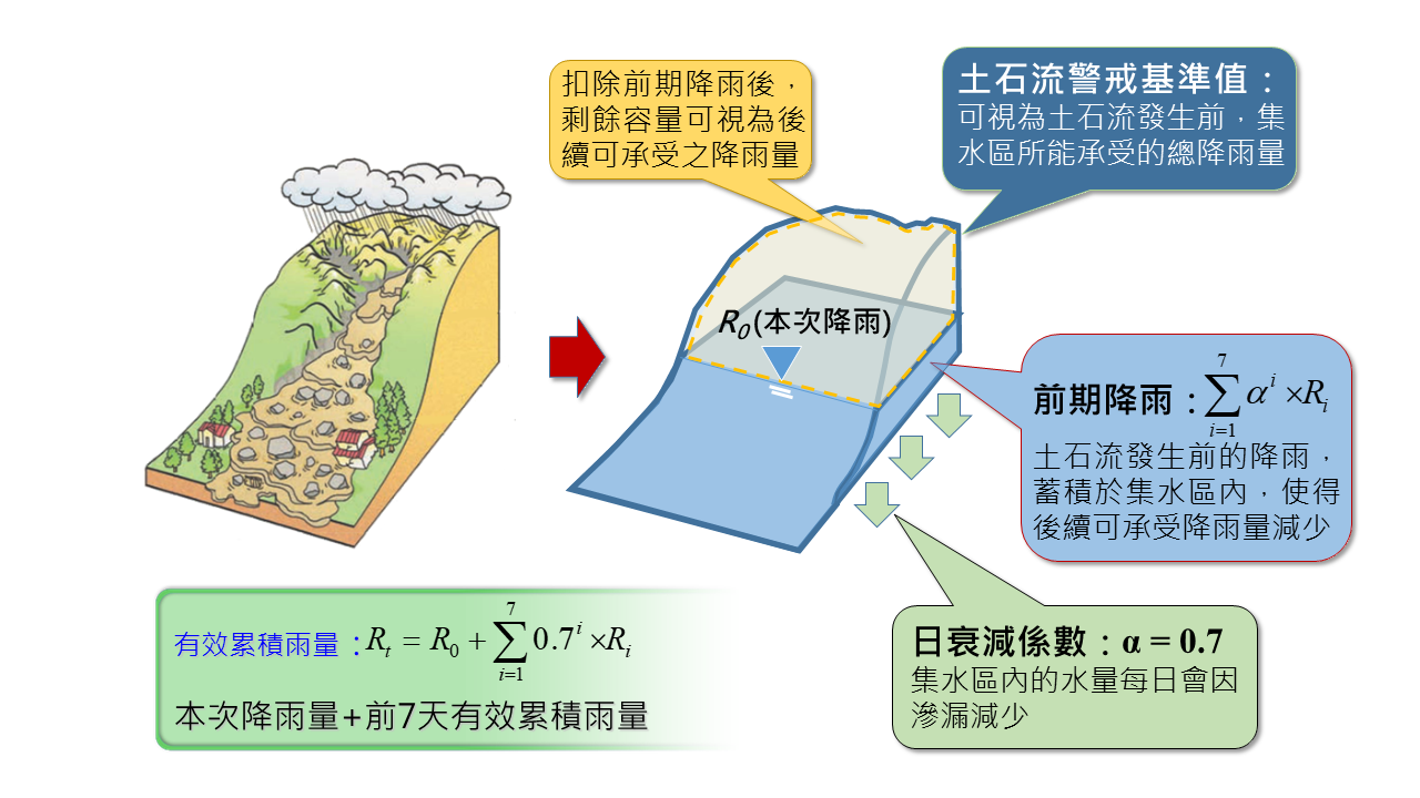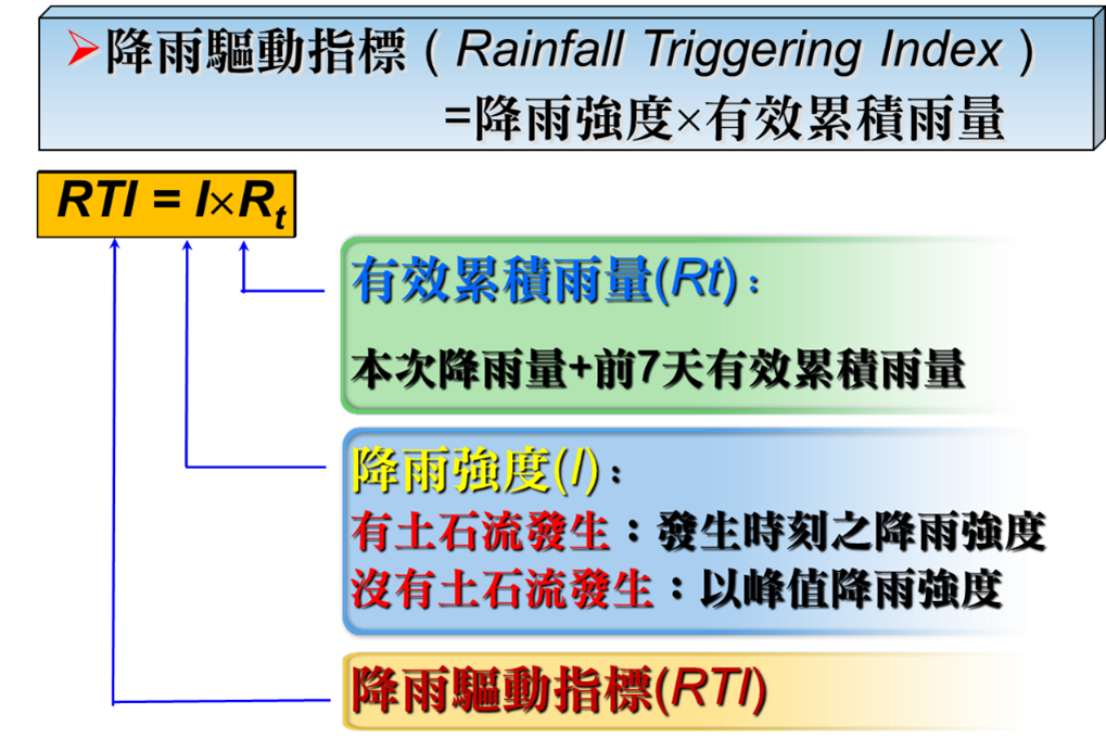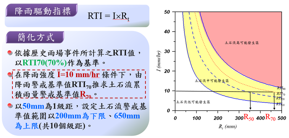 土石流警戒基準值(rainfall criteria for debris flow warning)係利用中央氣象署之雨量資料,以有效累積雨量(Rt)及降雨強度(I)兩降雨參數之乘積為降雨驅動指標(RTI),並依據土石流潛勢溪流鄰近之參考雨量站,統計其歷史雨量資料及土石流發生資料,計算出土石流降雨警戒門檻值RTI70(下標數字代表土石流發生可能性)。