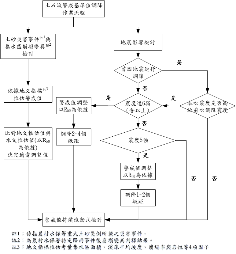 - 受地震影響調降之鄉鎮區,在未調升回原警戒值前,若未發生高於原本調降震度之地震,維持土石流警戒基準值;若震度高於原先調降之震度,則重新進行警戒值檢討。