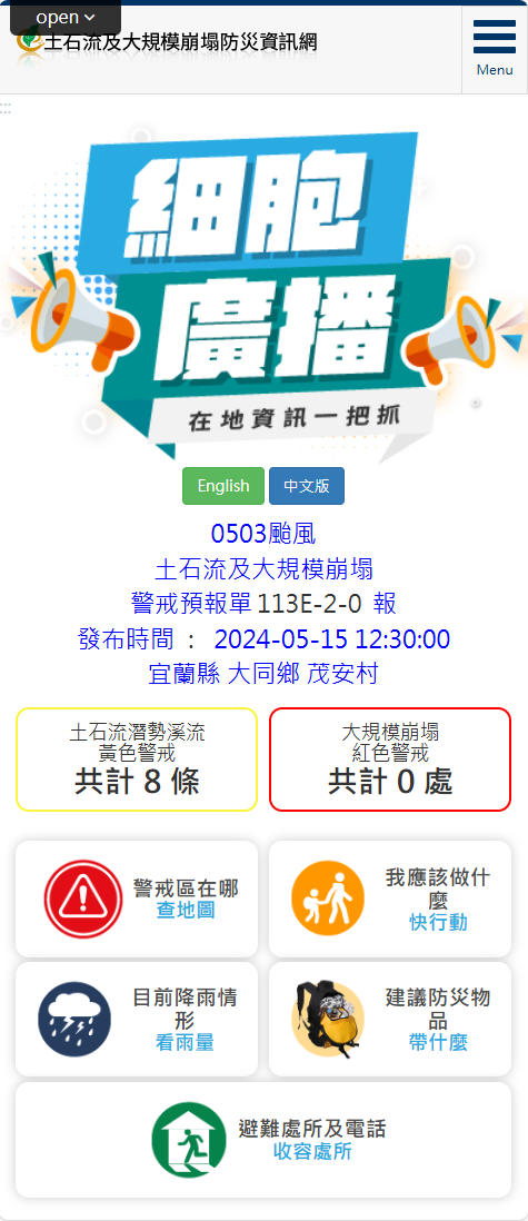 「土石流及大規模崩塌警戒細胞廣播訊息」是利用行動通信系統的 「細胞廣播服務技術 (Cell Broadcast Service,CBS )」,提供政府得以在短時間內,大量傳送土石流及大規模崩塌警戒訊息到土石流及大規模崩塌警戒發布範圍內的民眾手機,使社會大眾及早掌握離災、避災之資訊。