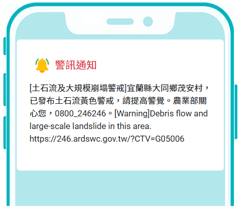 土石流及大規模崩塌警戒細胞廣播訊息係運用行動通訊系統基地臺,將訊息廣播至特定區域內所有手機,以即時通知民眾;但如果短時間出入基地臺訊息推播範圍,並不會重複接收到告警訊息。當手機接收到災防告警訊息時,會發出特殊的告警聲響並振動,與一般簡訊略有不同,惟請不必驚慌,應當提高警覺、及早應變。