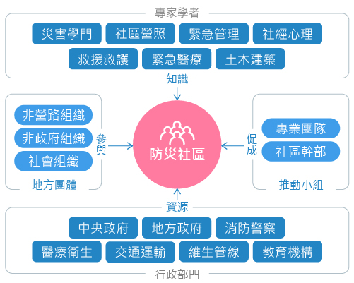 在推動防災社區的過程中,必須藉由「民眾參與」的過程,透過災害與防救災相關知識、技術的學習,強化民眾的防救災知識與技能,並藉由推動減災、預防的措施,來減少社區中可能釀成災害的因子,降低災害生發生的機會。