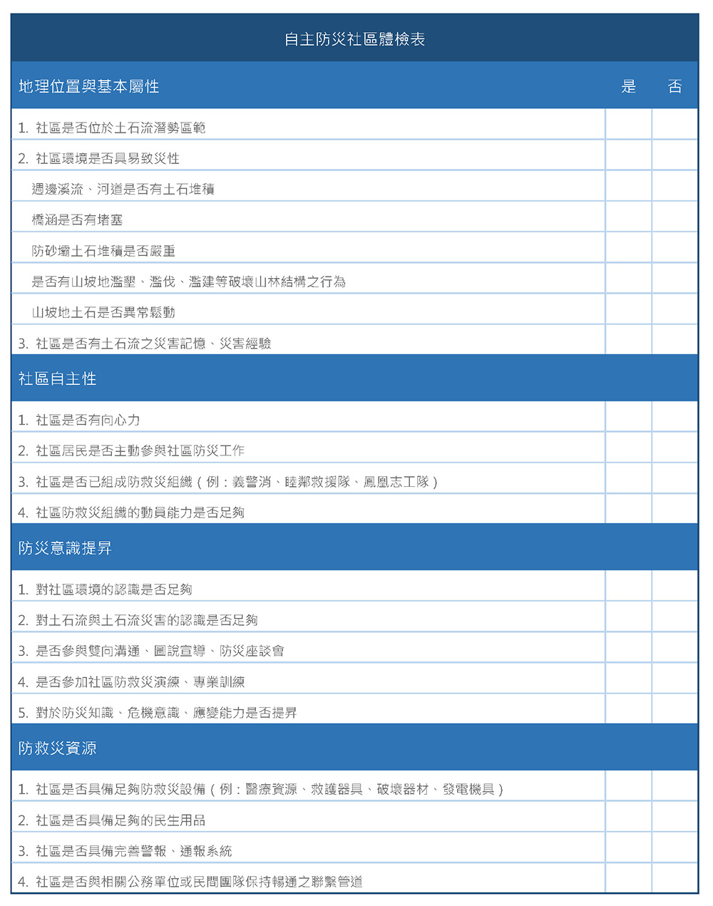 檢核看看您所居住的社區,是否位於土石流潛勢溪流區域?防災工作項目都完備嗎?是否達到土石流自主防災社區應具備的條件呢?