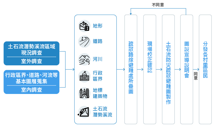 先取得相片基本圖(1/5,000或1/10,000)至現場調查,於圖上作初步規劃;並與村里長聯絡,取得潛勢區域內之保全住戶聯絡資料;訪談土石流災害發生當地居民之避難區與安全處所,並判斷其安全性或協助找尋疏散路線、避難處所、緊急救災直昇機起降位置等。
